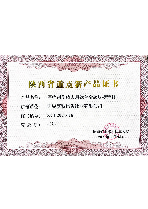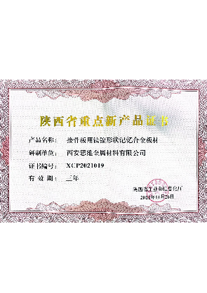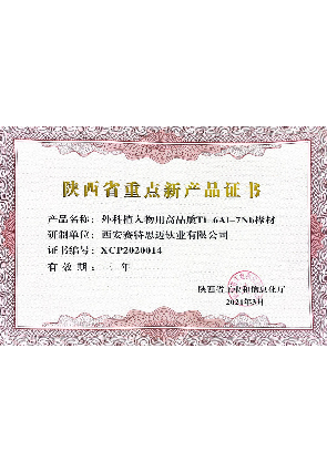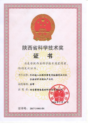 陜西省重點新產(chǎn)品:“外科植入用高品質(zhì)Ti-6Al-7Nb棒材”、“醫(yī)療創(chuàng)傷用鈦合金超厚壁管材”、“接骨板用鈦鎳形狀記憶合金板材”